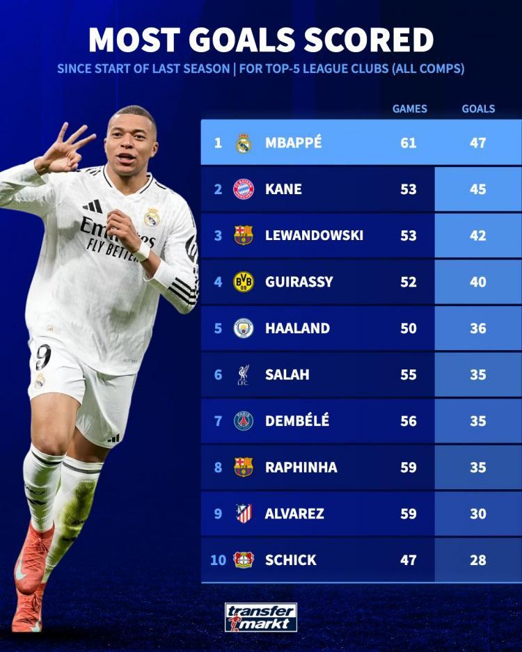 据德国转会市场统计,姆巴佩加盟皇马以来攻入47粒进球,五大联赛球员同期最多。